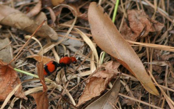 These insects are wasps, not ants. Females are wingless and covered with dense hair, superficially resembling ants. The red velvet-ant is the largest velvet-ant species, reaching about 3/4 inch in length. They are black overall with patches of dense orange-red hair on the thorax and abdomen. Males are similar but have wings and cannot sting.