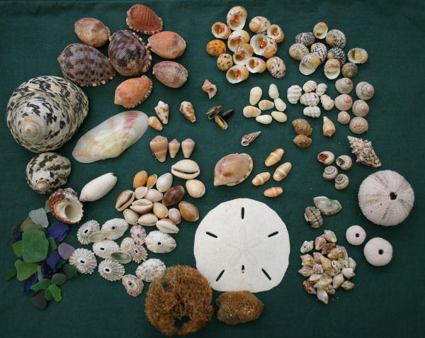For those among you who are not malacologists, I will identify some of the items in the photo. There’s a nice Sunrise Tellin, some Reticulated Cowrie-helmets, some cone shells (Crown cones and Mouse cones), several Nerites (Bleeding Tooth, Four-toothed, and Tesselate), some Orange Marginella, a Lamellose Wentletrap, a nice Scotch Bonnet, four Flamingo Tongues, four Tree Snails (not from the beach), three Sea Urchins, a small Chiton, a pile of Dove Shells, a Sand Dollar, couple of sponges, a bunch of Cowries, several different kinds of Limpets, and a pile of beach glass.