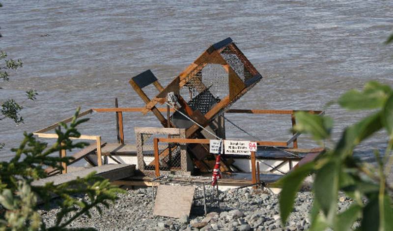 The next day we flew back to the Chitina airport. The Copper River passes right by the airport and the local folks were out catching Copper River Red Salmon and King Salmon either in dip nets (hard to imagine) or in their fish wheels. This is a fish wheel or half of one anyway. The other half is under water. It is turned by the current of the river, going from left to right in the photo. Fish swimming along in the current swim get scooped into the basket, which keeps turning. As the wheel gets to the top of the arc, the fish slides down the chute and plops into a box which is partially under water. The fisher-person watches all this from a comfortable chair and reaches into the cooler and pops another beer! At the end of an hour or a day (depending on the fishing), the fisher-person walks down the plank, reaches into the basket and plucks out several 30 to 40 pound salmon!