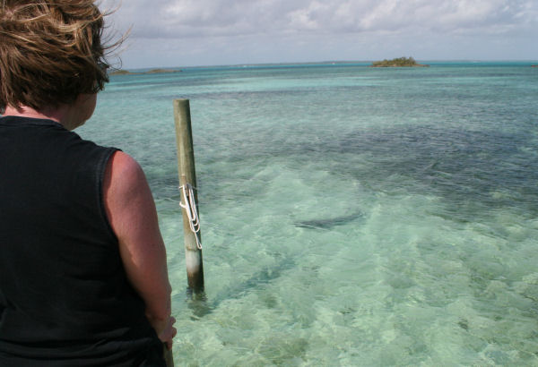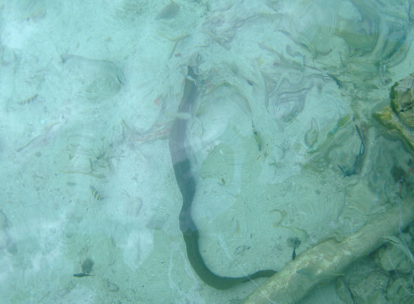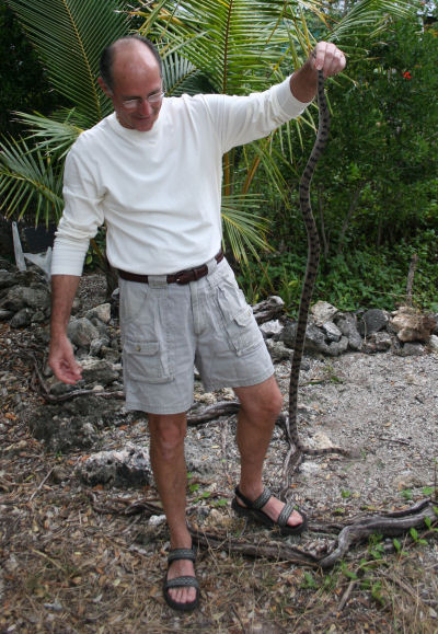 Friends- I mentioned last time that we were enjoying a visit from some of Paula's family while we were here on Tilloo. In addition to those folks, we have had several "critter" visitors with whom we share our island paradise. Of course, there are the regulars...the hermit crabs, curly-tailed lizards, and the anoles, plus we've seen the two American Oystercatchers that were on our beach last year. Here are some shots of some of our other visitors. When our neighbors, Don and Stephanie, were here, Don found a five foot Abaco Island Boa (Epicrates exsul). Over the years we have probably seen a dozen or so of these guys, but never one this large. They are harmless to humans and feed on small mammals, birds, and the aforementioned lizards. ![]() We've also have a Yellow-crowned Night-Heron (Nyctanassa violacea), who likes to stroll up and down our path at night. We have encountered him (or her) a few times, but we always see lots of tracks in the sand each morning. Here's a shot of him wading in the water. ![]() Living underneath our dock, in amongst some rubble left over from previous docks (this is our third), we have a beautiful 3.5 foot Green Moray Eel (Gymnothorax funebris). We've seen him (or her?) half a dozen times this year. He's pretty shy but he does venture out from time to time. Paula managed to get a photo of him a week or so ago. If you look closely you will also see some gray snapper and a sargent major or two. ![]() A couple of times when we have ventured out onto the dock we have seen a medium sized Southern Stingray (Dasyatis americana) buried up in the sand resting. This one is about three feet across from wingtip to wingtip and maybe five and a half feet nose to tail. ![]() A couple of days before the guests left us we were fishing out on the dock and noticed a large dark shape approaching in the water from the north. It turned out to be a young Tiger Shark (Galeocerdo cuvier). While the photo doesn't really show the distinctive coloring, we all noticed the pattern and later confirmed the species in our fish book. This animal was at least five feet long and hung around the dock for several minutes before cruising off to the south. ![]() Of course, our most important and enjoyable visitors were Paula's family. Brother Michael and his wife Andrea and sister Jean (aka Sis) stayed here for a week. We fished, we talked, we walked on the beach, we visited Hope Town, we swam at Tilloo Bank, we had a grand old time. Here is the whole crew in Hope Town with the Elbow Reef Light in the background. ![]() That's (left to right) Sis, Michael, Andrea and you probably know those other two. We've only got ten more days on Tilloo...where has the time gone. We've still got so much to do before we get back to civilization! More beach walking, shell collecting, napping, etc., etc. Our adventure continues... P&P |