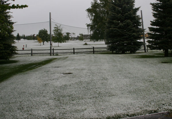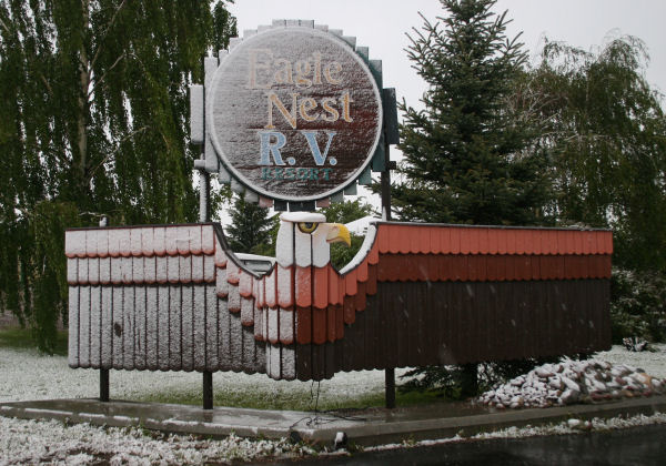 Greetings...sorry it's been so long since my last note. I'll put some stuff up on the web site in a few days to catch up on the past month. The big news today is that it is snowing in Polson...Those of you on the East Coast might be enjoying the warm weather...but here in Montana, it is now 12:30PM...and it is snowing!! We woke up this morning to a major "dusting" of the white stuff. It was snowing when I walked up to Wheat Montana (like Panera) at 9:00AM and it is still snowing now. ![]() This was the view out our front door this morning...looking toward the golf course on the other side of the fence. ![]() Enjoy summer in Montana as a "Camp Host" ,,, ![]() ...at Eagle Nest RV Resort!!! The truth is that we love it here, no matter the weather. We're working with a great crew of friends, for a wonderful owner, in a fantastic park...on an exceptional schedule. We work three days (just finished our third shift) and have twelve days off (today is day two!). Our great RV adventure continues...in spite of diesel at $4.50 per gallon! P&P |