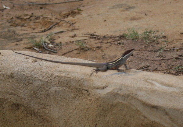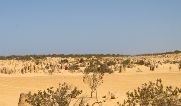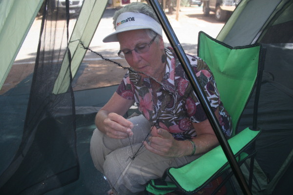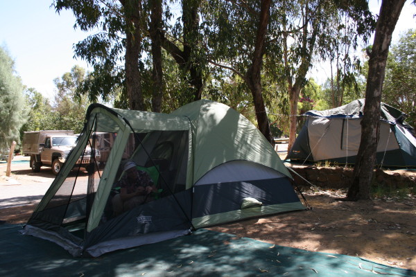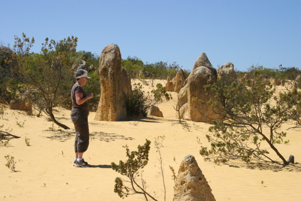 G'day- Our first stop after leaving Perth was Jurian Bay, a couple hundred kilometers up the coast. Our main reason for visiting there was to see the Pinnacles in Nambung National Park. We got there fine and set up our tent...and noticed that the wind was blowing pretty steady. We set off to explore the town and get a bite to eat before settling in at the caravan park for the evening. On returning to the park, we found our tent in a heap...two poles were broken and there was a three foot tear in the porch netting. It was not a pretty sight! I did not take a picture. We got the tent poles repaired after an hour or so of trying to thread that elastic stuff down the fiberglass poles and attempted to get the tent set up once more...but it was not possible. The wind was too strong. We packed everything in the car and fled to a nearby motel. We were not feeling very good at that point. The next day we decided to check out the Pinnacles...and here they are. You can find a bit more about the place by checking http://www.australianexplorer.com/nambung_national_park.htm. The next time we set up the tent was in Kilbarri, a beautiful little town a bit further up the coast. Everything went fine, and Paula and I stitched up the tear in the netting...and things are now almost as good as new. This also did a lot to overcome our bad feelings after finding the tent in a heap. Here's a shot of Paula doing her magic with the needle and thread. So here's what our whole tent looks like set up at the site we had at Kilbarri... And here's one of the visitors to our site... While he looks relaxed at about 14 inches long...when he runs, he stands upright on his (or her) two back legs and scoots along. I think he's a Lash-tailed Water Dragon, but I haven't been able to positively identify him yet. Australia day is tomorrow...so there will be a big celebration...we're in Geraldton, if you want to look us up on a map So our adventure continues... P&P |